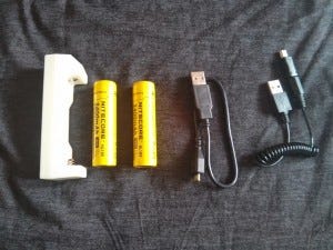 Left to right: ML-102 18650 charger can charge any USB device, two 18650 batteries, my Micro USB cable, and a Mini USB cable for charging the batteries
