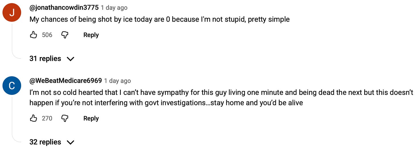 The idea that Alex Pretti deserved to be executed because he may or may not have tried to reach for his pistol after being assaulted and tackled to the ground by a dozen psychopaths is a complete perversion of morality, and the people who believe this are just as much a part of the problem as the psychopaths in uniform enforcing Trumps’s orders.